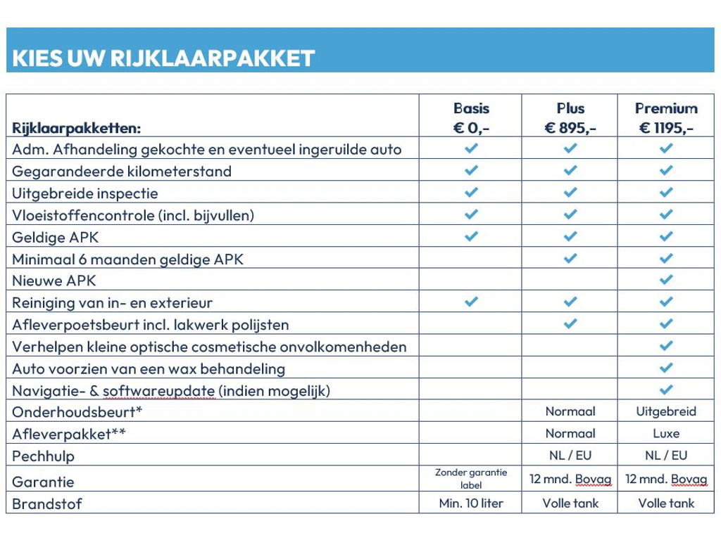 Het rijklaarpakket Basis is inclusief de volgende zaken: administratieve afhandeling van de gekochte en eventueel ingeruilde auto, gegarandeerde kilometerstand, uitgebreide inspectie, vloeistoffencontrole (incl. bijvullen), geldige APK en reiniging van in- en exterieur. Verder is er minimaal 10 liter brandstof inbegrepen. *Zonder garantie label.